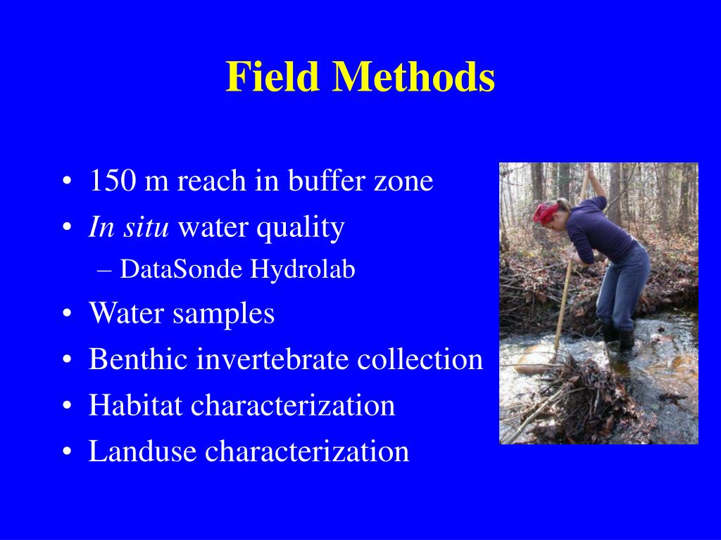 Field Methods • 150 m reach in buffer zone • In situ water quality • DataSonde Hydrolab • Water samples • Benthic invertebrate collection • Habitat characterization • Landuse characterization