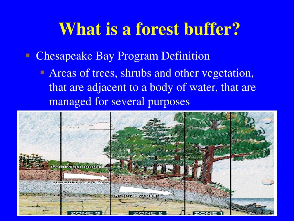 What is a forest buffer? • Chesapeake Bay Program Definition • Areas of trees, shrubs and other vegetation, that are adjacent to a body of water, that are managed for several purposes