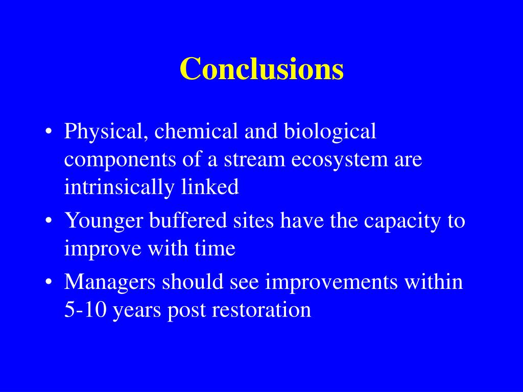 Conclusions • Physical, chemical and biological components of a stream ecosystem are intrinsically linked • Younger buffered sites have the capacity to improve with time • Managers should see improvements within 5-10 years post restoration