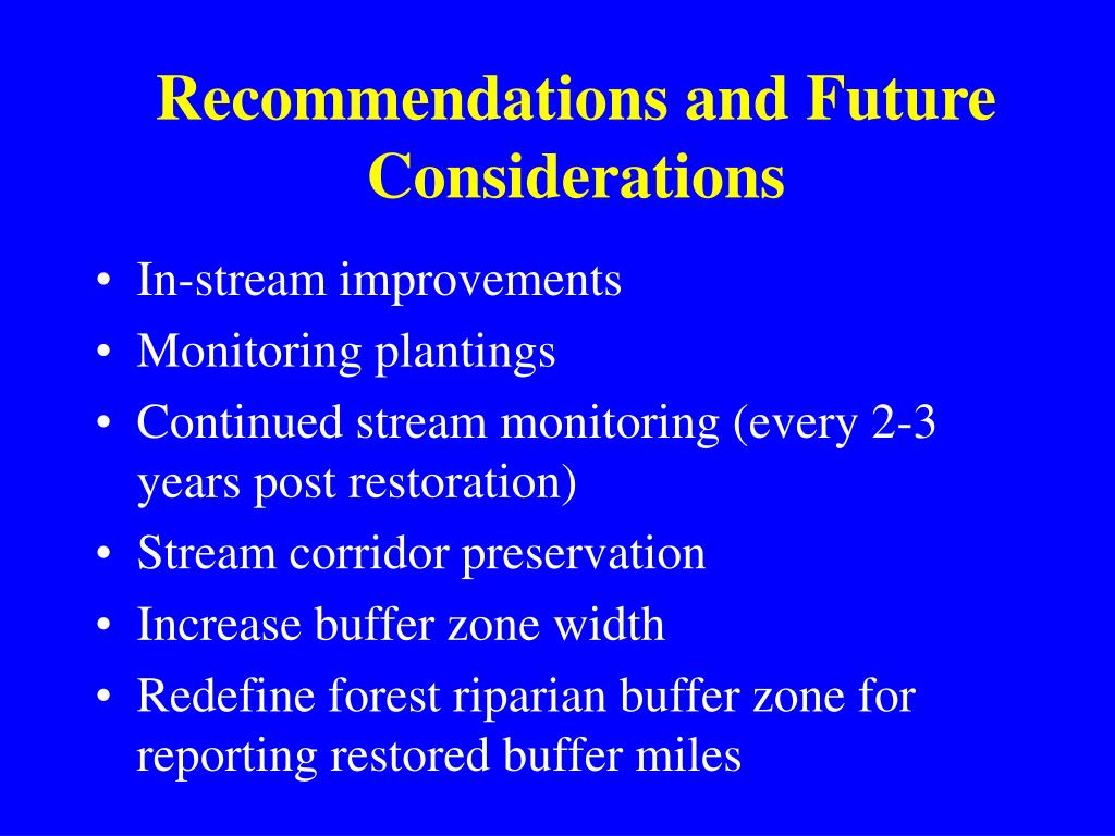 Recommendations and Future Considerations • In-stream improvements • Monitoring plantings • Continued stream monitoring (every 2-3 years post restoration) • Stream corridor preservation • Increase buffer zone width • Redefine forest riparian buffer zone for reporting restored buffer miles