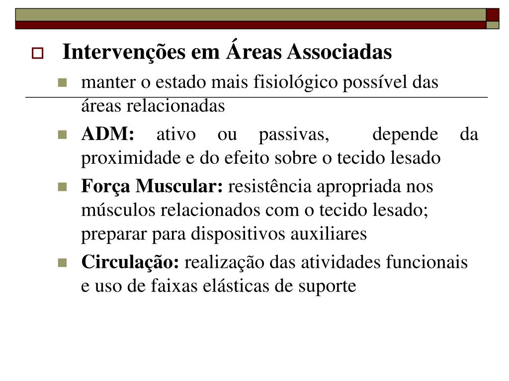 Intervenções em Áreas Associadas • manter o estado mais fisiológico possível das áreas relacionadas • ADM: ativo ou passivas, depende da proximidade e do efeito sobre o tecido lesado • Força Muscular: resistência apropriada nos músculos relacionados com o tecido lesado; preparar para dispositivos auxiliares • Circulação: realização das atividades funcionais e uso de faixas elásticas de suporte