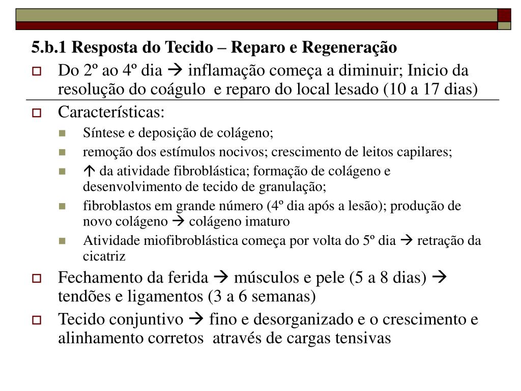 5.b.1 Resposta do Tecido – Reparo e Regeneração • Do 2º ao 4º dia inflamação começa a diminuir; Inicio da resolução do coágulo e reparo do local lesado (10 a 17 dias) • Características: • Síntese e deposição de colágeno; • remoção dos estímulos nocivos; crescimento de leitos capilares; • da atividade fibroblástica; formação de colágeno e desenvolvimento de tecido de granulação; • fibroblastos em grande número (4º dia após a lesão); produção de novo colágeno colágeno imaturo • Atividade miofibroblástica começa por volta do 5º dia retração da cicatriz • Fechamento da ferida músculos e pele (5 a 8 dias) tendões e ligamentos (3 a 6 semanas) • Tecido conjuntivo fino e desorganizado e o crescimento e alinhamento corretos através de cargas tensivas