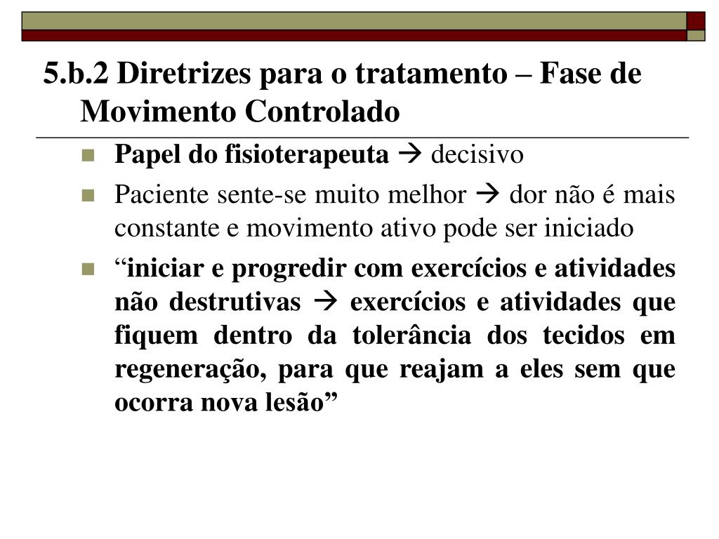 5.b.2 Diretrizes para o tratamento – Fase de Movimento Controlado • Papel do fisioterapeuta decisivo • Paciente sente-se muito melhor dor não é mais constante e movimento ativo pode ser iniciado • “iniciar e progredir com exercícios e atividades não destrutivas exercícios e atividades que fiquem dentro da tolerância dos tecidos em regeneração, para que reajam a eles sem que ocorra nova lesão”