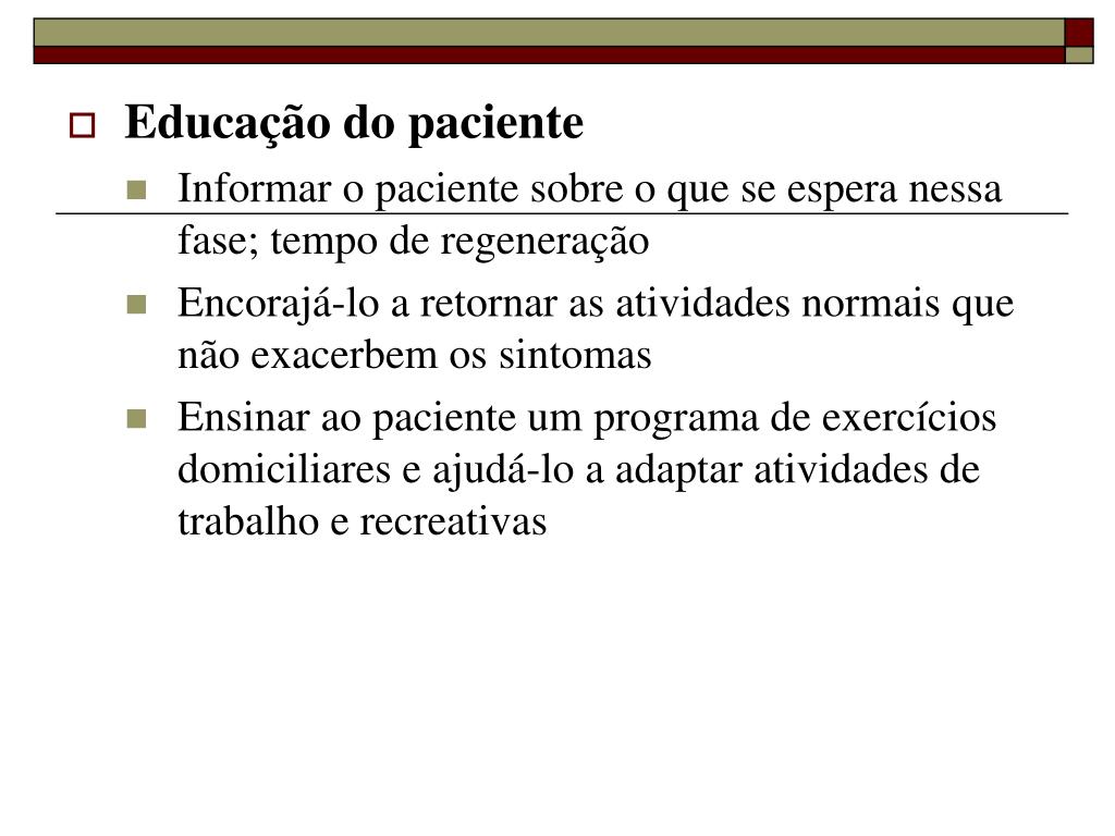 Educação do paciente • Informar o paciente sobre o que se espera nessa fase; tempo de regeneração • Encorajá-lo a retornar as atividades normais que não exacerbem os sintomas • Ensinar ao paciente um programa de exercícios domiciliares e ajudá-lo a adaptar atividades de trabalho e recreativas
