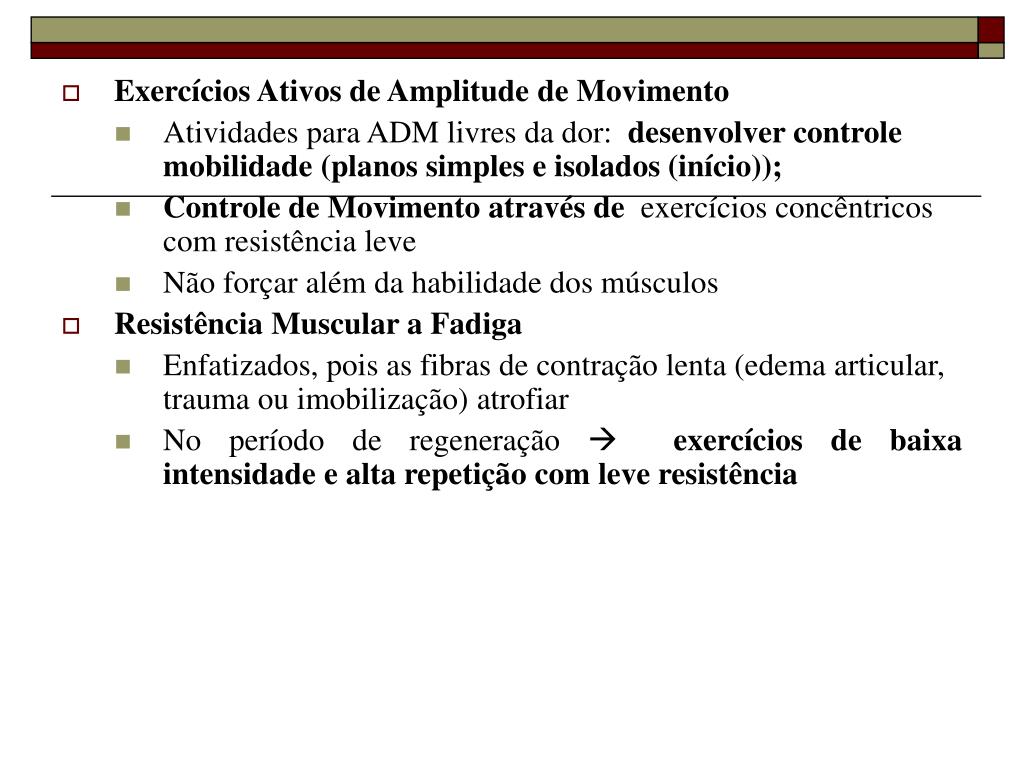 Exercícios Ativos de Amplitude de Movimento • Atividades para ADM livres da dor: desenvolver controle mobilidade (planos simples e isolados (início)); • Controle de Movimento através de exercícios concêntricos com resistência leve • Não forçar além da habilidade dos músculos • Resistência Muscular a Fadiga • Enfatizados, pois as fibras de contração lenta (edema articular, trauma ou imobilização) atrofiar • No período de regeneração exercícios de baixa intensidade e alta repetição com leve resistência