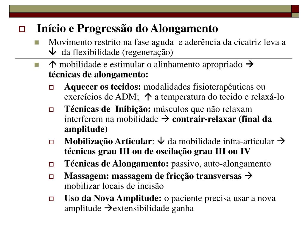 Início e Progressão do Alongamento • Movimento restrito na fase aguda e aderência da cicatriz leva a da flexibilidade (regeneração) • mobilidade e estimular o alinhamento apropriado técnicas de alongamento: • Aquecer os tecidos: modalidades fisioterapêuticas ou exercícios de ADM; a temperatura do tecido e relaxá-lo • Técnicas de Inibição: músculos que não relaxam interferem na mobilidade contrair-relaxar (final da amplitude) • Mobilização Articular: da mobilidade intra-articular técnicas grau III ou de oscilação grau III ou IV • Técnicas de Alongamento: passivo, auto-alongamento • Massagem:massagem de fricção transversas mobilizar locais de incisão • Uso da Nova Amplitude: o paciente precisa usar a nova amplitude extensibilidade ganha