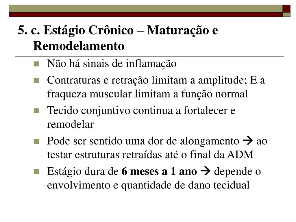 5. c. Estágio Crônico – Maturação e Remodelamento • Não há sinais de inflamação • Contraturas e retração limitam a amplitude; E a fraqueza muscular limitam a função normal • Tecido conjuntivo continua a fortalecer e remodelar • Pode ser sentido uma dor de alongamento ao testar estruturas retraídas até o final da ADM • Estágio dura de 6 meses a 1 ano depende o envolvimento e quantidade de dano tecidual