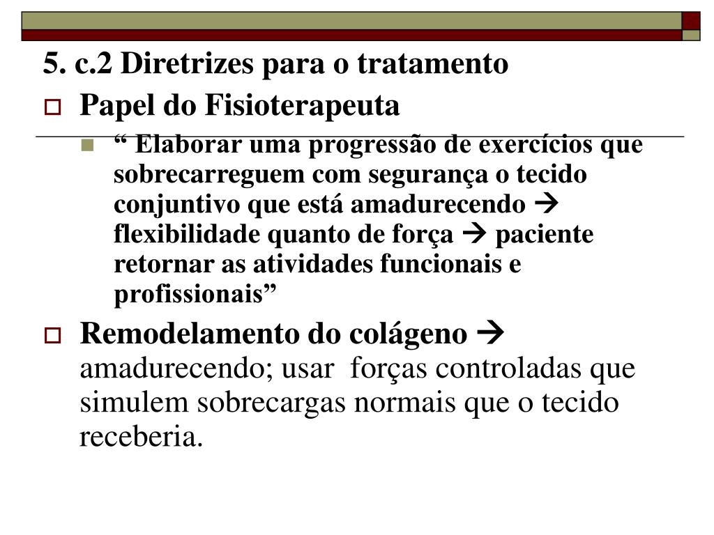 5. c.2 Diretrizes para o tratamento • Papel do Fisioterapeuta • “ Elaborar uma progressão de exercícios que sobrecarreguem com segurança o tecido conjuntivo que está amadurecendo flexibilidade quanto de força paciente retornar as atividades funcionais e profissionais” • Remodelamento do colágeno amadurecendo; usar forças controladas que simulem sobrecargas normais que o tecido receberia.