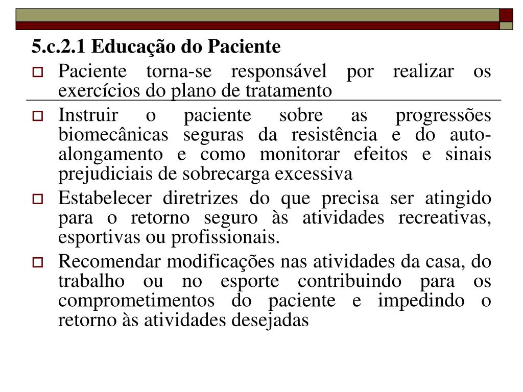 5.c.2.1 Educação do Paciente • Paciente torna-se responsável por realizar os exercícios do plano de tratamento • Instruir o paciente sobre as progressões biomecânicas seguras da resistência e do auto-alongamento e como monitorar efeitos e sinais prejudiciais de sobrecarga excessiva • Estabelecer diretrizes do que precisa ser atingido para o retorno seguro às atividades recreativas, esportivas ou profissionais. • Recomendar modificações nas atividades da casa, do trabalho ou no esporte contribuindo para os comprometimentos do paciente e impedindo o retorno às atividades desejadas