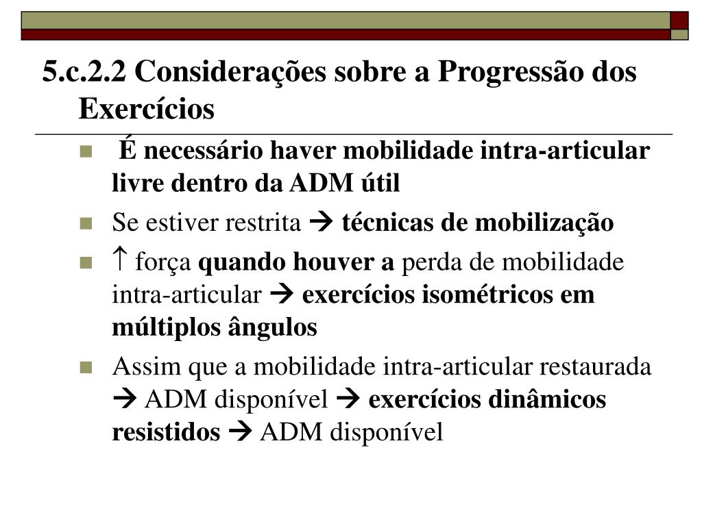 5.c.2.2 Considerações sobre a Progressão dos Exercícios • É necessário haver mobilidade intra-articular livre dentro da ADM útil • Se estiver restrita técnicas de mobilização • força quando houver a perda de mobilidade intra-articular exercícios isométricos em múltiplos ângulos • Assim que a mobilidade intra-articular restaurada ADM disponível exercícios dinâmicos resistidos ADM disponível