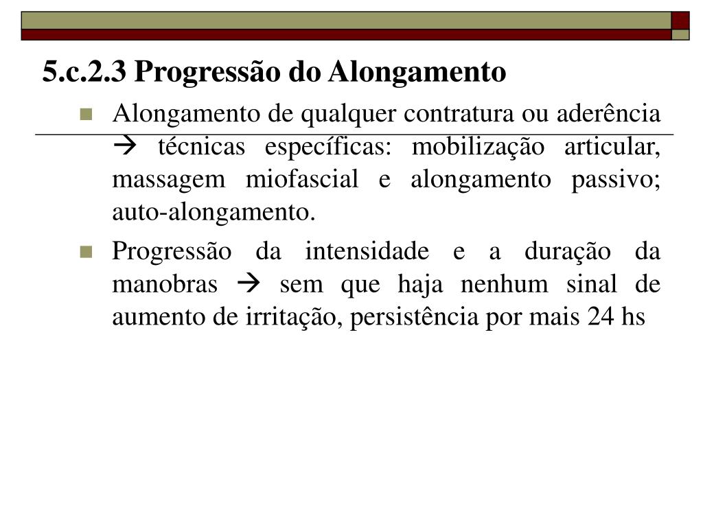 5.c.2.3 Progressão do Alongamento • Alongamento de qualquer contratura ou aderência técnicas específicas: mobilização articular, massagem miofascial e alongamento passivo; auto-alongamento. • Progressão da intensidade e a duração da manobras sem que haja nenhum sinal de aumento de irritação, persistência por mais 24 hs
