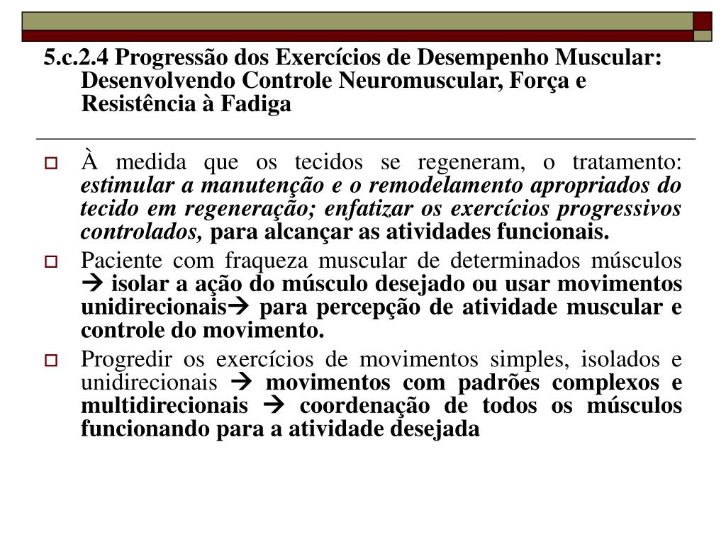 5.c.2.4 Progressão dos Exercícios de Desempenho Muscular: Desenvolvendo Controle Neuromuscular, Força e Resistência à Fadiga • À medida que os tecidos se regeneram, o tratamento: estimular a manutenção e o remodelamento apropriados do tecido em regeneração; enfatizar os exercícios progressivos controlados, para alcançar as atividades funcionais. • Paciente com fraqueza muscular de determinados músculos isolar a ação do músculo desejado ou usar movimentos unidirecionais para percepção de atividade muscular e controle do movimento. • Progredir os exercícios de movimentos simples, isolados e unidirecionais movimentos com padrões complexos e multidirecionais coordenação de todos os músculos funcionando para a atividade desejada