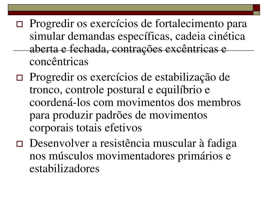 Progredir os exercícios de fortalecimento para simular demandas específicas, cadeia cinética aberta e fechada, contrações excêntricas e concêntricas • Progredir os exercícios de estabilização de tronco, controle postural e equilíbrio e coordená-los com movimentos dos membros para produzir padrões de movimentos corporais totais efetivos • Desenvolver a resistência muscular à fadiga nos músculos movimentadores primários e estabilizadores