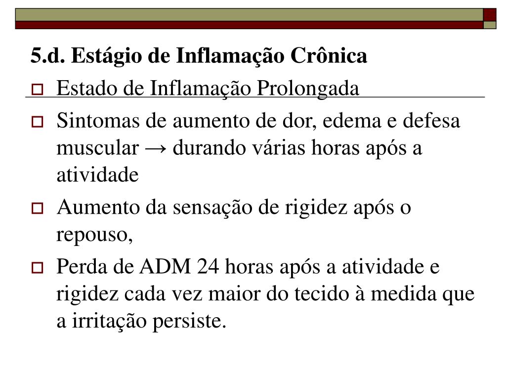 5.d. Estágio de Inflamação Crônica • Estado de Inflamação Prolongada • Sintomas de aumento de dor, edema e defesa muscular → durando várias horas após a atividade • Aumento da sensação de rigidez após o repouso, • Perda de ADM 24 horas após a atividade e rigidez cada vez maior do tecido à medida que a irritação persiste.