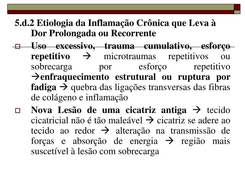 5.d.2 Etiologia da Inflamação Crônica que Leva à Dor Prolongada ou Recorrente • Uso excessivo, trauma cumulativo, esforço repetitivo microtraumas repetitivos ou sobrecarga por esforço repetitivo enfraquecimento estrutural ou ruptura por fadiga quebra das ligações transversas das fibras de colágeno e inflamação • Nova Lesão de uma cicatriz antiga tecido cicatricial não é tão maleável cicatriz se adere ao tecido ao redor alteração na transmissão de forças e absorção de energia região mais suscetível à lesão com sobrecarga