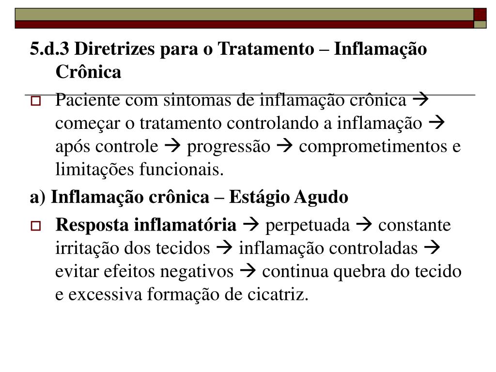 5.d.3 Diretrizes para o Tratamento – Inflamação Crônica • Paciente com sintomas de inflamação crônica começar o tratamento controlando a inflamação após controle progressão comprometimentos e limitações funcionais. a) Inflamação crônica – Estágio Agudo • Resposta inflamatória perpetuada constante irritação dos tecidos inflamação controladas evitar efeitos negativos continua quebra do tecido e excessiva formação de cicatriz.
