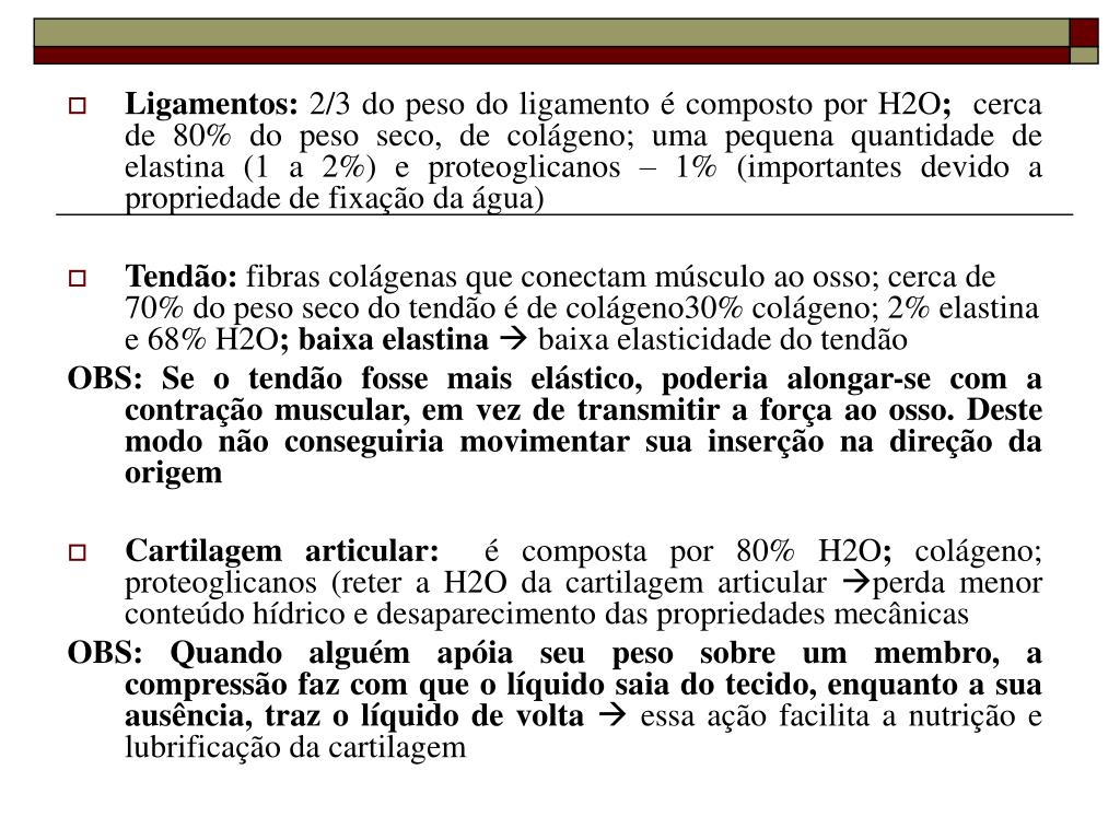 Ligamentos: 2/3 do peso do ligamento é composto por H2O; cerca de 80% do peso seco, de colágeno; uma pequena quantidade de elastina (1 a 2%) e proteoglicanos – 1% (importantes devido a propriedade de fixação da água) • Tendão: fibras colágenas que conectam músculo ao osso; cerca de 70% do peso seco do tendão é de colágeno30% colágeno; 2% elastina e 68% H2O; baixa elastina baixa elasticidade do tendão OBS: Se o tendão fosse mais elástico, poderia alongar-se com a contração muscular, em vez de transmitir a força ao osso. Deste modo não conseguiria movimentar sua inserção na direção da origem • Cartilagem articular: é composta por 80% H2O; colágeno; proteoglicanos (reter a H2O da cartilagem articular perda menor conteúdo hídrico e desaparecimento das propriedades mecânicas OBS: Quando alguém apóia seu peso sobre um membro, a compressão faz com que o líquido saia do tecido, enquanto a sua ausência, traz o líquido de volta essa ação facilita a nutrição e lubrificação da cartilagem