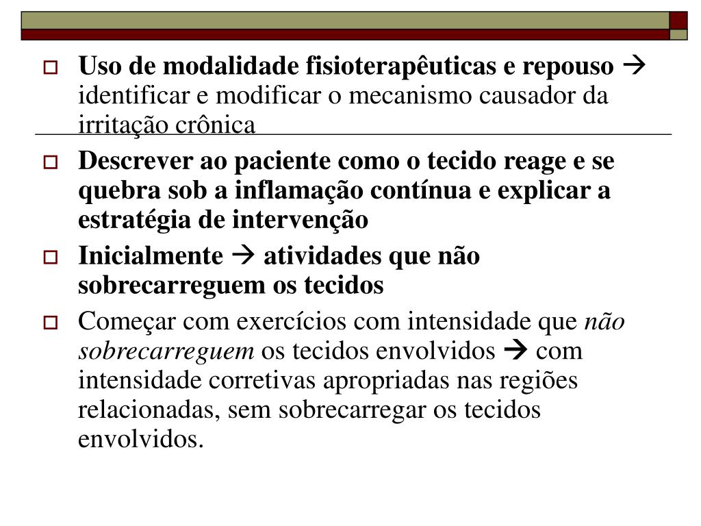 Uso de modalidade fisioterapêuticas e repouso identificar e modificar o mecanismo causador da irritação crônica • Descrever ao paciente como o tecido reage e se quebra sob a inflamação contínua e explicar a estratégia de intervenção • Inicialmente atividades que não sobrecarreguem os tecidos • Começar com exercícios com intensidade que não sobrecarreguem os tecidos envolvidos com intensidade corretivas apropriadas nas regiões relacionadas, sem sobrecarregar os tecidos envolvidos.