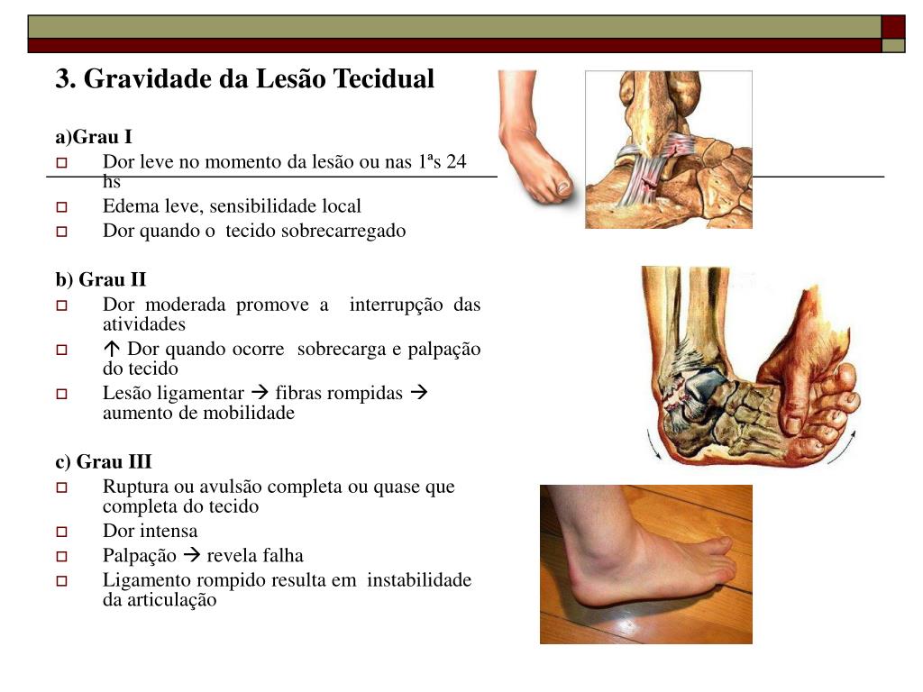 3. Gravidade da Lesão Tecidual a)Grau I • Dor leve no momento da lesão ou nas 1ªs 24 hs • Edema leve, sensibilidade local • Dor quando o tecido sobrecarregado b) Grau II • Dor moderada promove a interrupção das atividades • Dor quando ocorre sobrecarga e palpação do tecido • Lesão ligamentar fibras rompidas aumento de mobilidade c) Grau III • Ruptura ou avulsão completa ou quase que completa do tecido • Dor intensa • Palpação revela falha • Ligamento rompido resulta em instabilidade da articulação