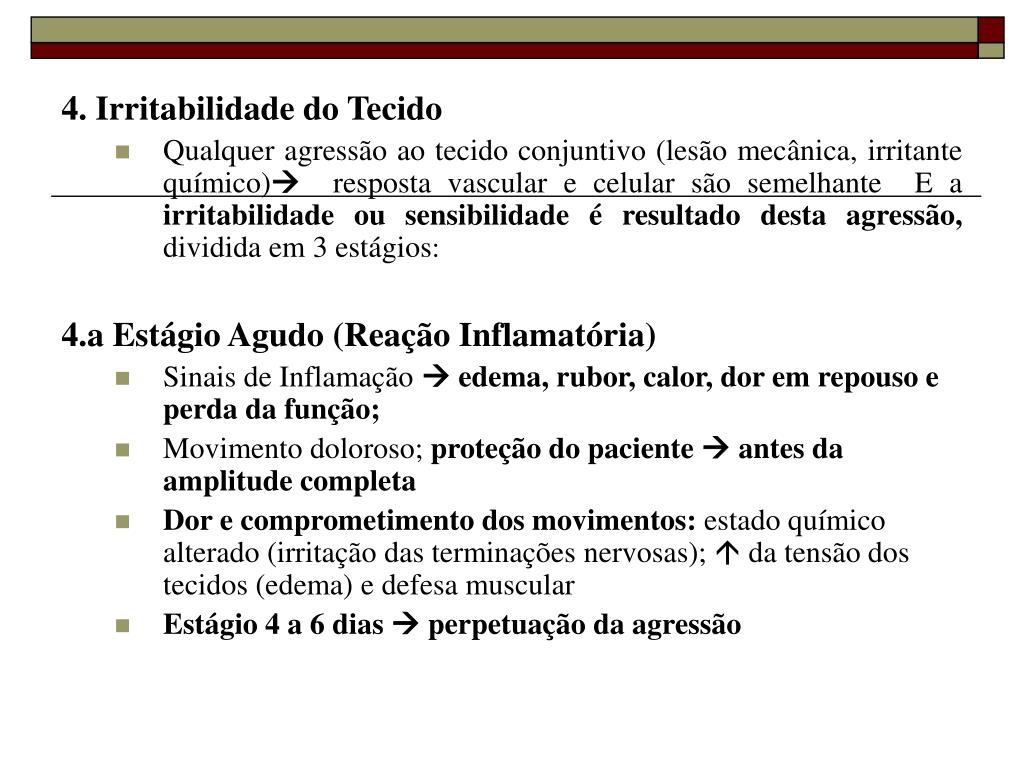4. Irritabilidade do Tecido • Qualquer agressão ao tecido conjuntivo (lesãomecânica, irritante químico) resposta vascular e celular são semelhante E a irritabilidade ou sensibilidade é resultado desta agressão, dividida em 3 estágios: 4.a Estágio Agudo (Reação Inflamatória) • Sinais de Inflamação edema, rubor, calor, dor em repouso e perda da função; • Movimento doloroso; proteção do paciente antes da amplitude completa • Dor e comprometimento dos movimentos: estado químico alterado (irritação das terminações nervosas); da tensão dos tecidos (edema) e defesa muscular • Estágio 4 a 6 dias perpetuação da agressão