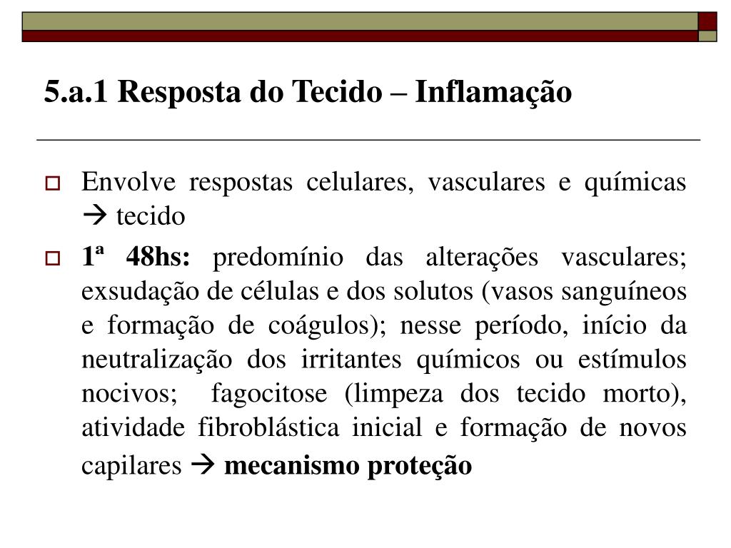 5.a.1 Resposta do Tecido – Inflamação • Envolve respostas celulares, vasculares e químicas tecido • 1ª 48hs: predomínio das alterações vasculares; exsudação de células e dos solutos (vasos sanguíneos e formação de coágulos); nesse período, início da neutralização dos irritantes químicos ou estímulos nocivos; fagocitose (limpeza dos tecido morto), atividade fibroblástica inicial e formação de novos capilares mecanismo proteção