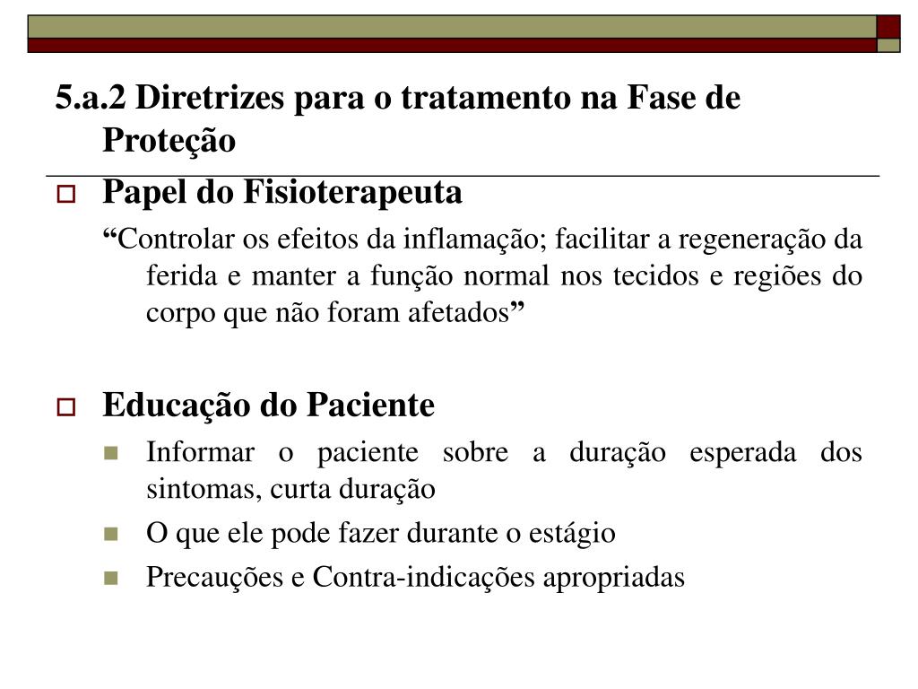 5.a.2 Diretrizes para o tratamento na Fase de Proteção • Papel do Fisioterapeuta “Controlar os efeitos da inflamação; facilitar a regeneração da ferida e manter a função normal nos tecidos e regiões do corpo que não foram afetados” • Educação do Paciente • Informar o paciente sobre a duração esperada dos sintomas, curta duração • O que ele pode fazer durante o estágio • Precauções e Contra-indicações apropriadas