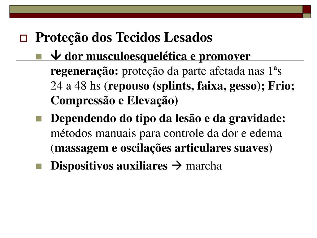 Proteção dos Tecidos Lesados • dor musculoesquelética e promover regeneração: proteção da parte afetada nas 1ªs 24 a 48 hs (repouso (splints, faixa, gesso); Frio; Compressão e Elevação) • Dependendo do tipo da lesão e da gravidade: métodos manuais para controle da dor e edema (massagem e oscilações articulares suaves) • Dispositivos auxiliares marcha