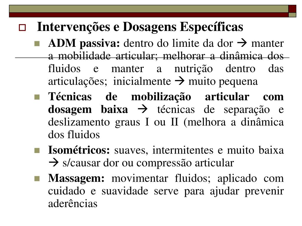 Intervenções e Dosagens Específicas • ADM passiva: dentro do limite da dor manter a mobilidade articular; melhorar a dinâmica dos fluidos e manter a nutrição dentro das articulações; inicialmente muito pequena • Técnicas de mobilização articular com dosagem baixa técnicas de separação e deslizamento graus I ou II (melhora a dinâmica dos fluidos • Isométricos: suaves, intermitentes e muito baixa s/causar dor ou compressão articular • Massagem: movimentar fluidos; aplicado com cuidado e suavidade serve para ajudar prevenir aderências
