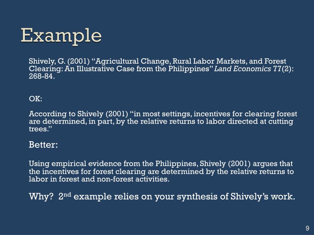 Example Shively, G. (2001) “Agricultural Change, Rural Labor Markets, and Forest Clearing: An Illustrative Case from the Philippines” Land Economics 77(2): 268-84. OK: According to Shively (2001) “in most settings, incentives for clearing forest are determined, in part, by the relative returns to labor directed at cutting trees.” Better: Using empirical evidence from the Philippines, Shively (2001) argues that the incentives for forest clearing are determined by the relative returns to labor in forest and non-forest activities. Why? 2nd example relies on your synthesis of Shively’s work.