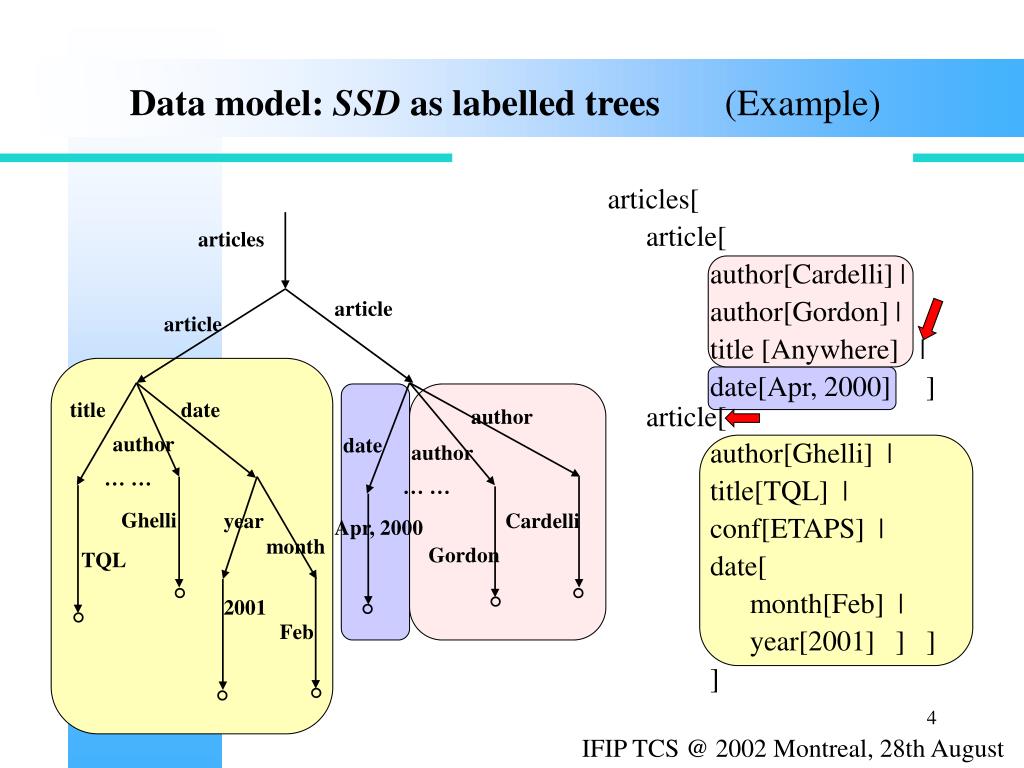 Data model: SSD as labelled trees (Example) articles[ article[ author[Cardelli] | author[Gordon] | title [Anywhere] | date[Apr, 2000] ] article[ author[Ghelli] | title[TQL] | conf[ETAPS] | date[ month[Feb] | year[2001] ] ] ] articles article article title date author author date author … … … … Ghelli year Cardelli Apr, 2000 month Gordon TQL 2001 Feb IFIP TCS @ 2002 Montreal, 28th August