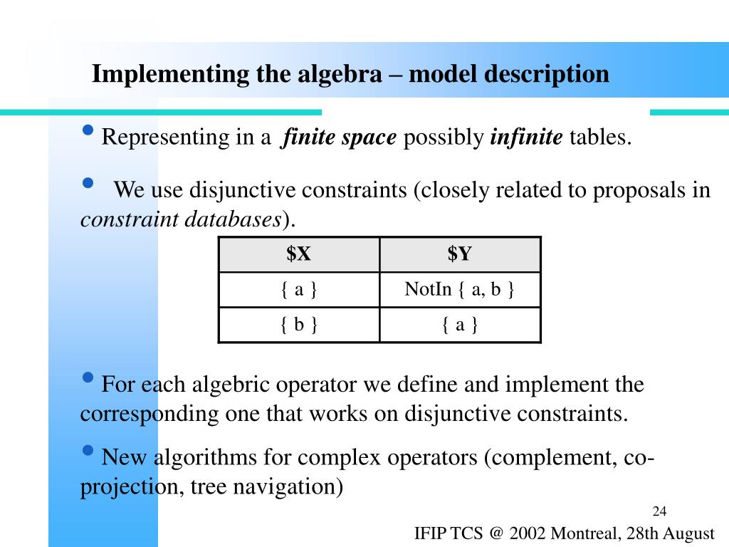 Implementing the algebra – model description $X $Y { a } NotIn { a, b } { b } { a } Representing in a finite space possibly infinite tables. We use disjunctive constraints (closely related to proposals in constraint databases). For each algebric operator we define and implement the corresponding one that works on disjunctive constraints. New algorithms for complex operators (complement, co-projection, tree navigation) IFIP TCS @ 2002 Montreal, 28th August
