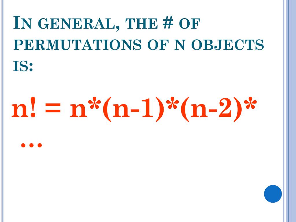 In general, the # of permutations of n objects is: n! = n*(n-1)*(n-2)*…