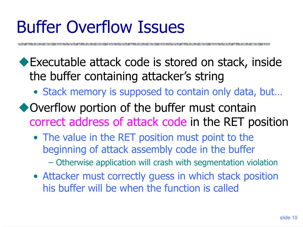 Buffer Overflow Issues • Executable attack code is stored on stack, inside the buffer containing attacker’s string • Stack memory is supposed to contain only data, but… • Overflow portion of the buffer must contain correct address of attack code in the RET position • The value in the RET position must point to the beginning of attack assembly code in the buffer • Otherwise application will crash with segmentation violation • Attacker must correctly guess in which stack position his buffer will be when the function is called