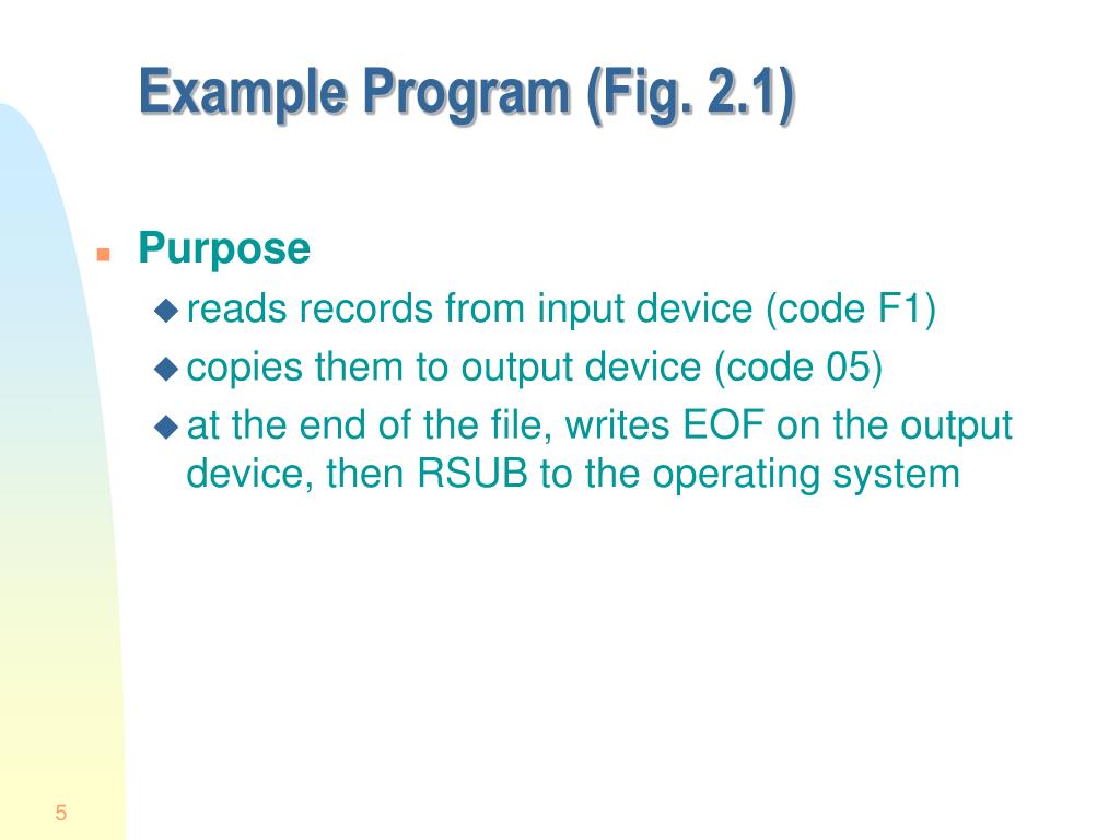 Example Program (Fig. 2.1) • Purpose • reads records from input device (code F1) • copies them to output device (code 05) • at the end of the file, writes EOF on the output device, then RSUB to the operating system