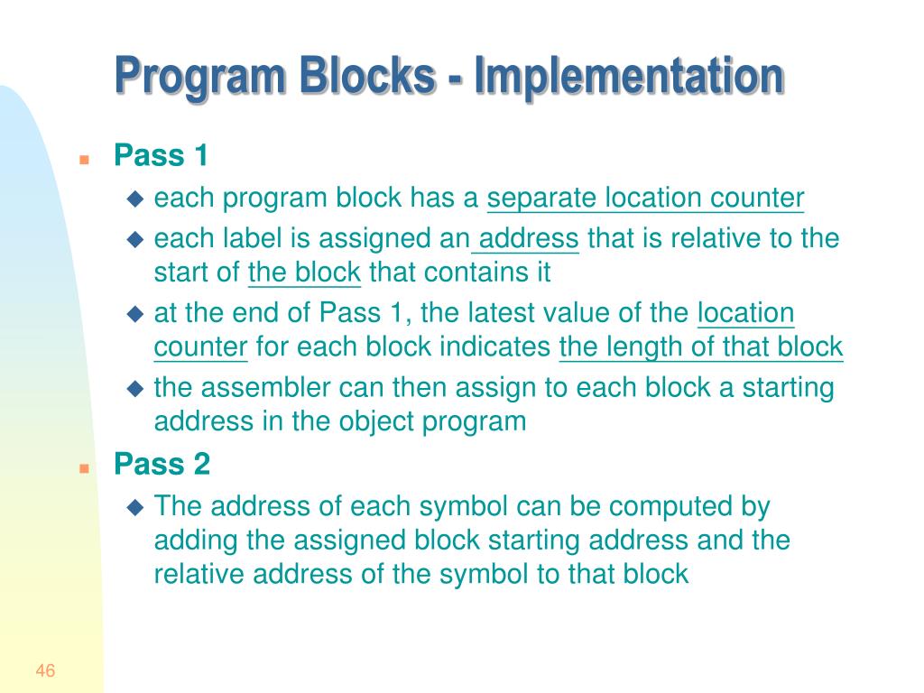 Program Blocks - Implementation • Pass 1 • each program block has a separate location counter • each label is assigned an address that is relative to the start of the block that contains it • at the end of Pass 1, the latest value of the location counter for each block indicates the length of that block • the assembler can then assign to each block a starting address in the object program • Pass 2 • The address of each symbol can be computed by adding the assigned block starting address and the relative address of the symbol to that block