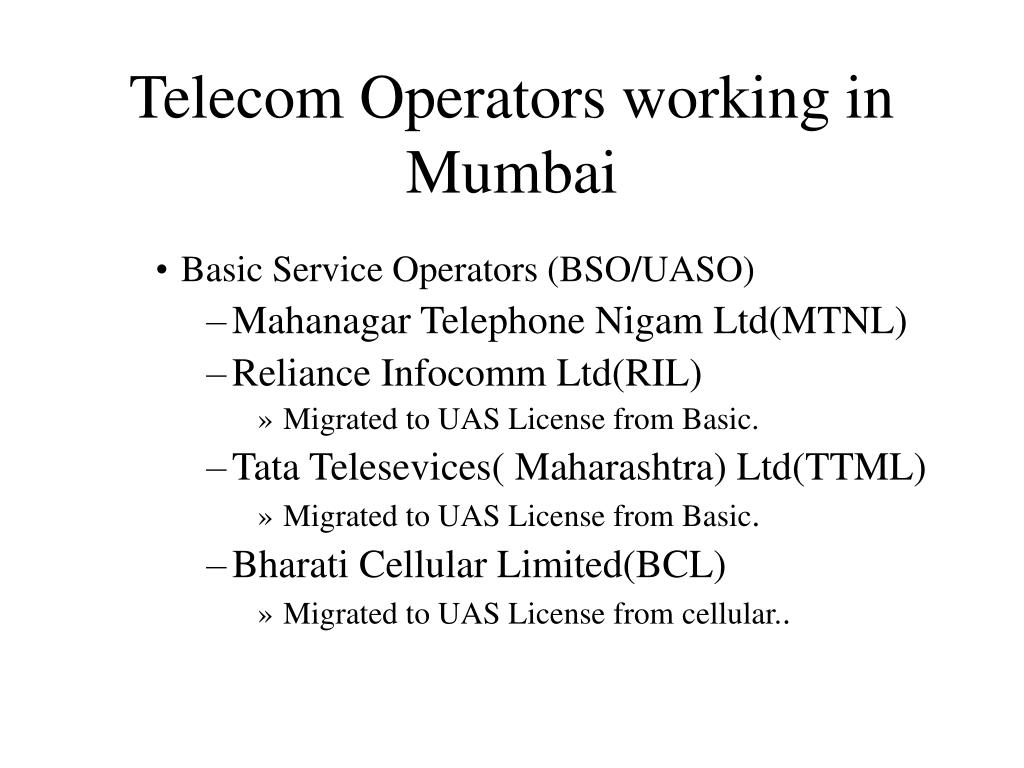 Telecom Operators working in Mumbai • Basic Service Operators (BSO/UASO) • Mahanagar Telephone Nigam Ltd(MTNL) • Reliance Infocomm Ltd(RIL) • Migrated to UAS License from Basic. • Tata Telesevices( Maharashtra) Ltd(TTML) • Migrated to UAS License from Basic. • Bharati Cellular Limited(BCL) • Migrated to UAS License from cellular..