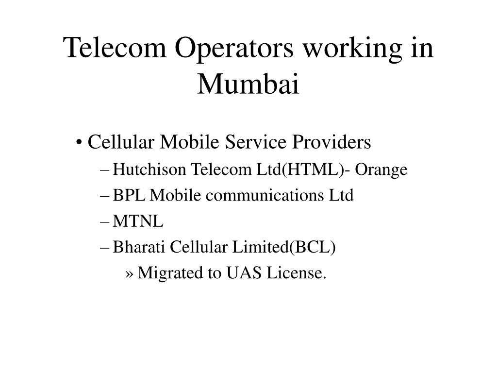Telecom Operators working in Mumbai • Cellular Mobile Service Providers • Hutchison Telecom Ltd(HTML)- Orange • BPL Mobile communications Ltd • MTNL • Bharati Cellular Limited(BCL) • Migrated to UAS License.