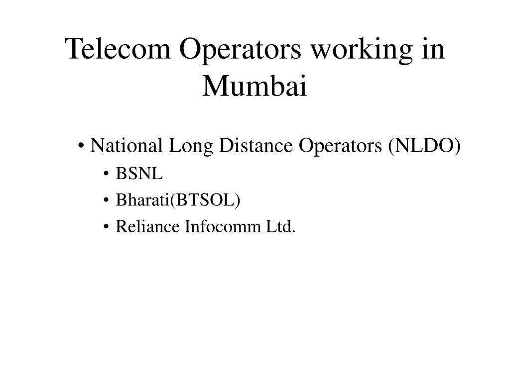 Telecom Operators working in Mumbai • National Long Distance Operators (NLDO) • BSNL • Bharati(BTSOL) • Reliance Infocomm Ltd.