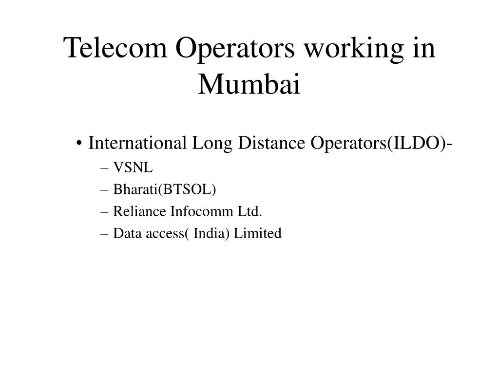 Telecom Operators working in Mumbai • International Long Distance Operators(ILDO)- • VSNL • Bharati(BTSOL) • Reliance Infocomm Ltd. • Data access( India) Limited