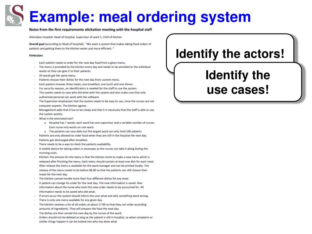 Example: meal ordering system Identify the actors! Identify theuse cases!