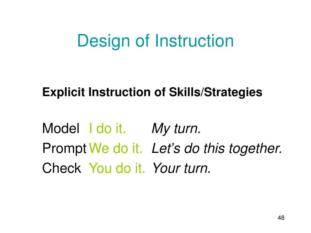 Design of Instruction Explicit Instruction of Skills/Strategies Model I do it.My turn. Prompt We do it.Let’s do this together. Check You do it.Your turn.