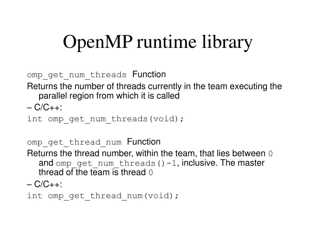 OpenMP runtime library omp_get_num_threads Function Returns the number of threads currently in the team executing the parallel region from which it is called – C/C++: int omp_get_num_threads(void); omp_get_thread_num Function Returns the thread number, within the team, that lies between 0 and omp_get_num_threads()-1, inclusive. The master thread of the team is thread 0 – C/C++: int omp_get_thread_num(void);