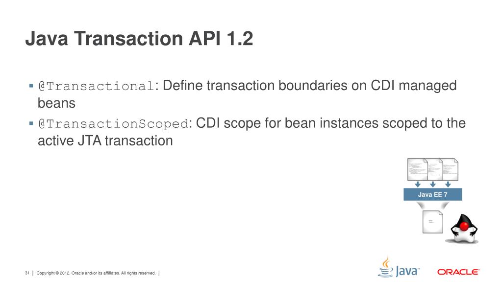 Java Transaction API 1.2 • @Transactional: Define transaction boundaries on CDI managed beans • @TransactionScoped: CDI scope for bean instances scoped to the active JTA transaction Java EE 7