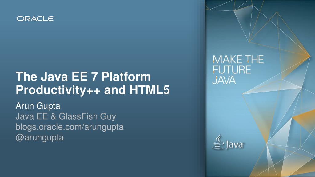 The Java EE 7 Platform Productivity++ and HTML5. Arun Gupta Java EE & GlassFish Guy blogs.oracle.com /arungupta @arungupta. Java: Broadest Industry Adoption. 9,000,000 JAVA DEVELOPERS. DEPLOYING TO 18 COMPLIANT APPLICATION SERVERS. Java EE 7 Platform Jun 12, 2013. Java EE 7 Themes.