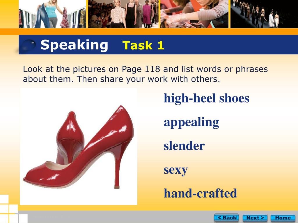 Speaking 1-2 Home < Back Next > Speaking Task 1 Look at the pictures on Page 118 and list words or phrases about them. Then share your work with others. high-heel shoes appealing slender sexy hand-crafted