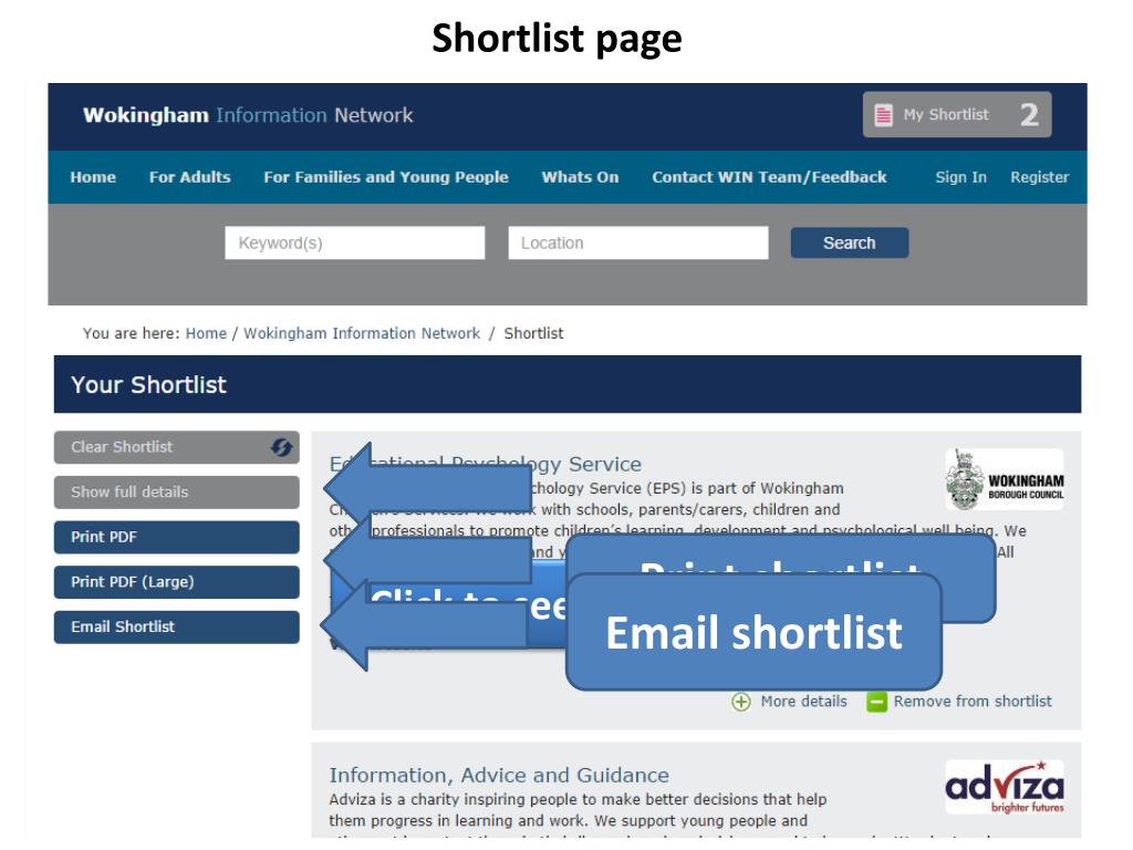 Navigating the Header The Wokingham Information Network Team welcome any feedback or questions about the directory. Clicking on the link takes you to an online form which is sent directly to the WIN Team The new ‘What’s On’ guide Search for events happening in and around the borough A shortlist of useful listings can be created whilst searching the directory. • A drop down menu of categories appears when the mouse cursor hovers over the link for the: • For Families and Young People • For Adults