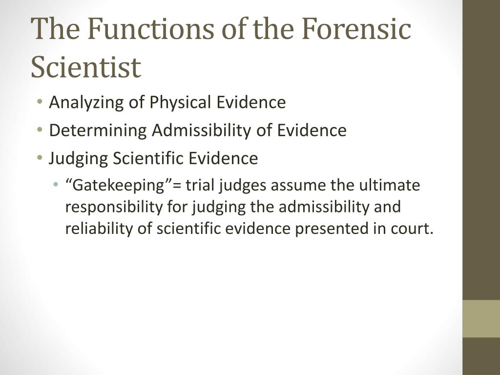 The Functions of the Forensic Scientist • Analyzing of Physical Evidence • Determining Admissibility of Evidence • Judging Scientific Evidence • “Gatekeeping”= trial judges assume the ultimate responsibility for judging the admissibility and reliability of scientific evidence presented in court.