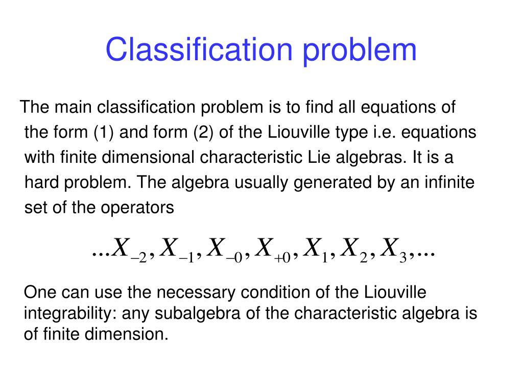 The main classification problem is to find all equations of the form (1) and form (2) of the Liouville type i.e. equations with finite dimensional characteristic Lie algebras. It is a hard problem. The algebra usually generated by an infinite set of the operators Classification problem One can use the necessary condition of the Liouville integrability: any subalgebra of the characteristic algebra is of finite dimension.