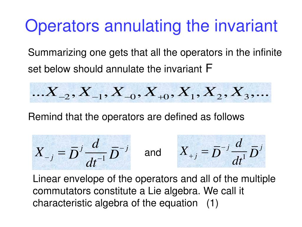 Operators annulating the invariant Summarizing one gets that all the operators in the infinite set below should annulate the invariant F Remind that the operators are defined as follows and Linear envelope of the operators and all of the multiple commutators constitute a Lie algebra. We call it characteristic algebra of the equation (1)