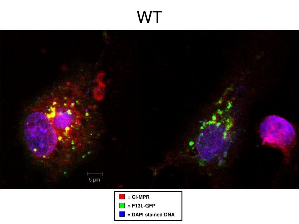 = CI-MPR = F13L-GFP = DAPI stained DNA WT